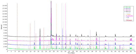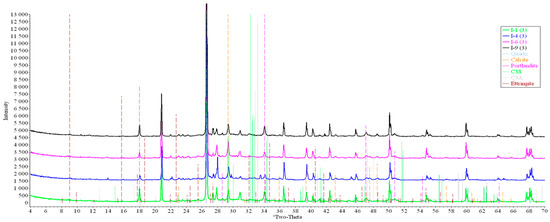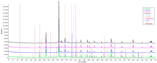 Analysis of the data obtained showed more intense dynamics of the calcium carbonate formation in samples of mode II at point 1 (closer to the outer surface) compared to samples of mode I. A distinctive feature of samples of mode I is the presence of ettringite at all points, which confirms the data of SEM.
