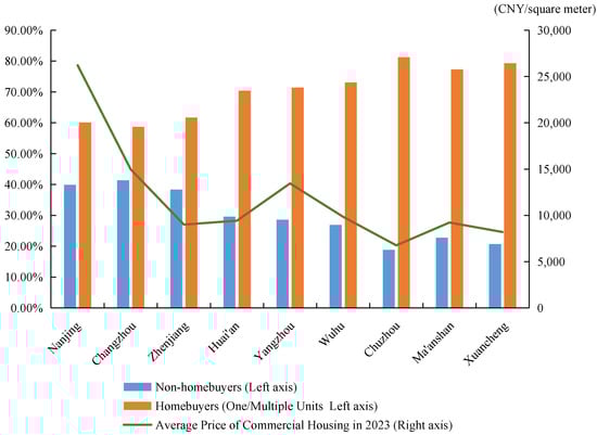 The situation of young people buying homes in the Nanjing Metropolitan Coordinating Region in the post-pandemic era is shown in Figure 1. Obviously, there is a negative correlation between the city’s housing prices and the proportion of local young homeowners. That is, the higher the price of housing in a city, the greater the proportion of young people who cannot afford to purchase a house. Among them, the highest housing price is Nanjing, the average price of commercial housing in Nanjing in 2022 was 26,772 CNY/square meter, and its rent reached 56.13 CNY/month/square meter in July 2023, in which the proportion of young people who have not purchased a house is as high as 39.9%. The lowest housing price is Chuzhou; the average price of commercial housing in Chuzhou in 2022 is only 6985 CNY/square meter, and the proportion of young homeowners is as high as 81.22%.