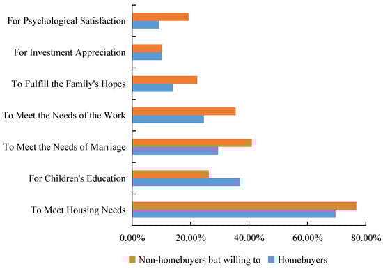 In order to understand the status of homeownership among young people, this paper analyzes their motivation to purchase housing. As the Figure 2 shows, housing needs, children’s educational needs, and marital needs are the top three factors considered by young homeowners. For non-homebuyers, housing needs, marital needs, and work needs are the main motivators. In contrast, family hopes, psychological fulfillment, and investment in value-added are less important. For young people, the rigid demand for housing far exceeds the demand for investment. This may be related to the implementation of a series of real estate policies by the country, which have effectively suppressed the increase in speculative demand, for example, purchase and loan restrictions policies.