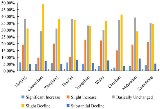 As can be shown from Figure 4, there is a paradox in the current real estate market of “increased pressure felt by residents and a decrease in actual housing prices”. According to research data, the youth in Yangzhou and Wuhu generally believe that the pressure to buy a home compared to the previous two years has not changed. With the exception of Yangzhou and Wuhu, young people in other cities generally felt that the pressure to buy a home had increased compared to two years ago. However, by comparing the average price of commercial properties in the first half of 2023 and 2021, this paper finds that house prices in eight of the nine cities in the Nanjing metropolitan area have declined compared to two years ago.