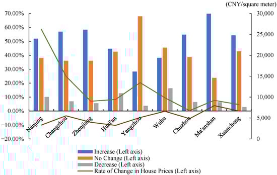 Changes in current pressure on young people to buy a home. Data source: Special Research on Housing Problems of New Citizens and Young People in the Nanjing Metropolitan Coordinating Region in 2023. Data on the rate of change in housing prices is based on commercial housing transaction prices from Anjuke.