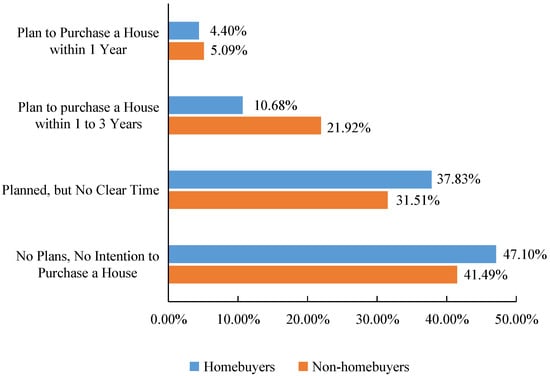 For non-homebuyers, future homeownership plans are primarily driven by rigid housing needs. For young people who have already purchased a house, their main motivation for future home purchases is to improve their current living environment or invest in real estate. The future willingness of young people to purchase houses is shown in Figure 5. Firstly, regardless of whether they have already bought a house or not, the proportion of young people who have no intention of buying a house in the future is the highest, exceeding 40%. Secondly, the proportion of young people who have plans to purchase a house in the future but have not determined a specific purchase time is the highest. This group of young people have a demand for buying a home, but currently still hold a wait-and-see attitude. Thirdly, the proportion of young people planning to purchase houses within the next three years is the lowest. Even for young people who have not purchased a house, the proportion of people planning to buy a house within the next three years is only 27.01%.