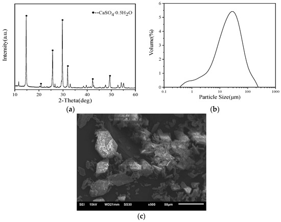 The phase composition of PBG is depicted in Figure 1a, which demonstrates that CaSO4-0.5H2O is the primary constituent of this PBG. According to GB/T 36141-2018 [22], the amount of CaSO4-0.5H2O was calculated to be 87.57 wt%. Gypsum powder’s apparent morphology as seen by scanning electron microscopy is depicted in Figure 1c, where it can be seen that the powder mostly takes the shape of a plate and contains a lot of irregularly shaped particles. Phosphorus, fluoride, alkali metal salt, and other organic contaminants were adsorbed onto the surface of the particles. The PBG particle size distribution is depicted in Figure 1b; the average particle size is 33.898 μm.