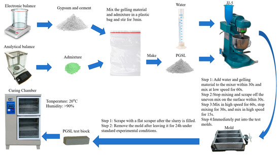 PBG was used as the primary cementitious material, and a small amount of PC was added to adjust the pH value of the system. The mass fraction of gypsum was 95%, and the mass fraction of cement was 5%. According to the test method stipulated in JC/T 1023-2021 [23], weighing was carried out by the proportions in Table 3, first stirring slowly for 60 s, scraping down the pan wall and mixing blade unevenly within 30 s, then stirring quickly for 60 s, and then stirring fast for 15 s after 60 s of static stopping until no bubbles were produced, to get the homogeneous slurry. Then, immediately loaded into a 40 mm by 40 mm by 160 mm cement sand test mold, the slurry is filled with a scraper to scrape flat. Then put the test mold into the constant temperature and humidity maintenance box (relative humidity ≥ 90%, temperature 20 °C ± 1 °C) for molding and maintenance. A flow chart for the specific preparation of gypsum self-leveling can be seen in Figure 2.