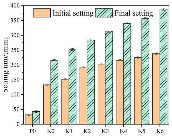 The impact of SG on the samples’ setting time is depicted in Figure 3. It has been discovered that adding either SG or PR will lengthen the PGSL setting time. P0’s beginning and final setting times are just 34 min and 43 min, which is considerably too little time and well below what is actually needed. In contrast, K0’s initial and final setting times are 134 min and 216 min, respectively, which can accommodate the needs of actual use. Additionally, the initial setting time and final setting time of PGSL both significantly increase when PR and SG are combined, with the effect on the final setting time being more pronounced. This indicates that the time between the initial setting time and the final setting time is also growing. This is because PR itself has a large number of amino and carboxyl groups that chelate with Ca2+ in the slurry, on the one hand, reducing the Ca2+ solubility of the system; on the other hand, these chelates cover the surface of gypsum crystals, changing the way dihydrate gypsum (CaSO4-2H2O) crystals grow, thus delaying the nucleation process of the nucleus, which is then manifested as a prolongation of gypsum coagulation time [27]. Additionally, SG contains a variety of functional groups, like carboxyl and hydroxyl groups, that can react with Ca2+ in the system to form chelates. Because PR has a higher adsorption capacity than SG, its influence on retardation is more pronounced. When these two retarders are compounded, the adsorption capacity of the whole system on Ca2+ is greatly strengthened, and the macroscopic performance of PGSL is prolonged in the coagulation time.