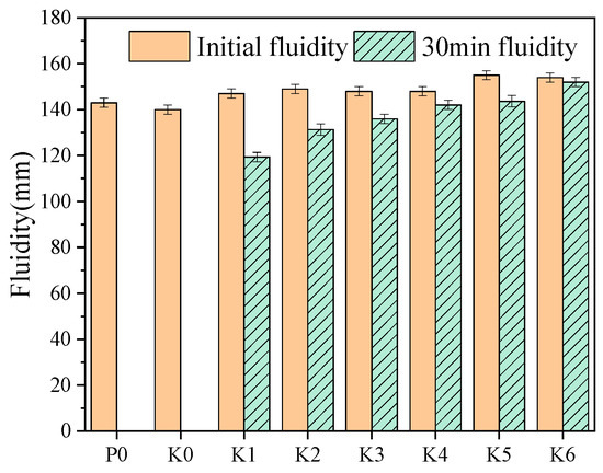 The impact of SG on the samples’ fluidity is depicted in Figure 4. As depicted in Figure 4, the early fluidity of PGSL is specifically enhanced with an increase in SG dose. This is due to the addition of SG to a certain extent to promote the dispersion of the PCE [28], which assists in water reduction. So, when sodium gluconate is added, the initial fluidity of the self-leveling increases. In addition, the 30 min fluidity of P0 and K0 is almost lost. P0 is because if only SG is added, the retarding effect is relatively limited, and the 30 min is close to the initial setting time, so there is no fluidity after 30 min, whereas K0 is due to the impurities of the PBG itself, such as phosphoric acid, fluorine, and phosphoric acid impurities. The 30 min fluidity of PGSL is significantly improved after the compounding of PR and SG, which is increased to 120 mm at the addition of 0.01%. With the increase of SG, the fluidity increased, and the fluidity loss before and after 30 min is only 2 mm at the addition of 0.06%. Therefore, the addition of SG significantly improves the fluidity of PGSL.