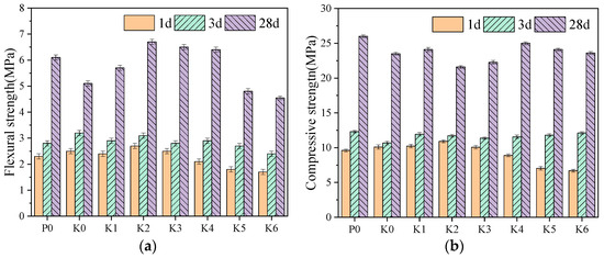 Figure 5 shows the effect of SG incorporation on the flexural and compressive strengths of PGSL. It can be seen that the late strength of K0 doped with PR alone is higher, while the early strength of P0 doped with SG alone is higher. The 1 d and 3 d flexural strengths of PGSL showed a trend of decreasing in the first rise and decreasing in the second rise with the increase of SG doping, while the 28 d strength showed a trend of increasing in the first rise and dropping in the second rise, with the flexural strength of K2 at 28 d, which is enhanced by 31.37%, showing the most significant increase. Gypsum self-leveling is combined with SG and PR, and it is discovered that the 28 d compressive strength of the self-leveling showed a rising and falling pattern with the rise of SG dosage, with the strength of K4 increasing most noticeably, with a 6.38% increase. The strength of K5 and K6 decreased more particularly, which may be due to the addition of excessive SG, which seriously slowed down gypsum’s hydration degree and thus reduced the strength. Comprehensively, when the SG dosage reaches 0.04%, although it will reduce the early strength, it still meets the early strength requirements of JC/T 1023-2021, and it can improve a certain amount of late strength.