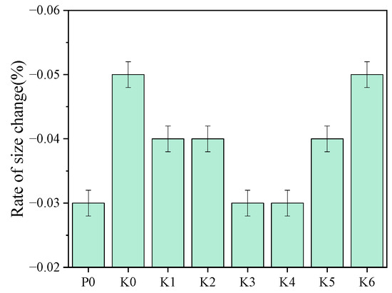 Figure 6 shows the effect of SG incorporation on the rate of size change of PGSL. From the graph, it can be seen that the rate of dimensional change of PGSL shows a trend of decreasing and then increasing with the addition of SG, with the lowest rate of size change when the SG doping is 0.03% and 0.04%, i.e., K3 and K4. Since construction gypsum’s theoretical water demand is 18.6% of its weight [29], the overall PGSL in this experiment demonstrated a phenomenon of shrinking. The amount of water given to PGSL in the experiment was significantly greater than the amount of water that was theoretically needed for it. As a result, during PGSL’s subsequent hydration process, the excess water separated as water vapor, which caused PGSL to shrink. In this experiment, some PCs were added, which might lead to micro-expansion in the later hydration stage, but it was not enough to make up for the shrinkage caused by the gypsum. As a result, the PGSL as a whole exhibits a propensity for contraction. During subsequent hydration, this separates extra water from the PGSL as water vapor.
