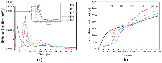 From Figure 6b, it can be seen that the early exothermic heat of hydration is less in K0 relative to P0, but the total exothermic heat is higher. The higher early cumulative exothermic heat in P0 may be because the single doping of SG does not significantly affect the hydration process of C3A, which makes the early exothermic heat of PC and gypsum cumulative. Thus, the early cumulative exothermic heat in P0 is higher. Co-doping with SG has a weakening effect on the cumulative exotherm of PGSL. According to general rules, the higher the heat of hydration, the greater the degree of hydration reaction, and the greater the fluidity loss [17,34]. However, as shown in Figure 6b, the heat of hydration decreases with an increase in SG, and the corresponding fluidity loss also decreases, which is consistent with Figure 4.