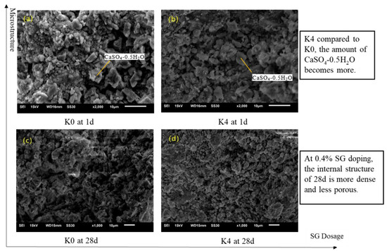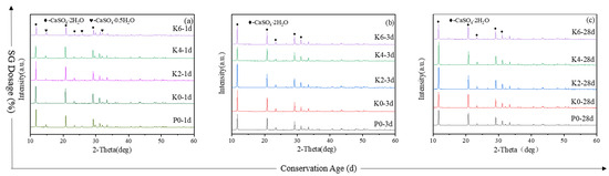 The XRD patterns of PGSL at 1 d, 3 d, and 28 d are displayed in Figure 8. The majority of the CaSO4-0.5H2O has been hydrated into CaSO4-2H2O after 1 d of hydration, as shown in Figure 7a. However, some of the CaSO4-0.5H2O remains unhydrated and has noticeable diffraction peaks. As shown in Figure 6a, the diffraction peaks of CaSO4-2H2O became more pronounced when SG was added, indicating that SG can postpone CaSO4-2H2O’s hydration. The XRD spectra of the PGSL hydrated for 3 d are displayed in Figure 7b. It is evident that at this point, CaSO4-2H2O has completely hydrated to become CaSO4-2H2O, with the unique peak of CaSO4-2H2O from K0 being more significant than that of P0. However, the CaSO4-2H2O diffraction peaks are most effective at a 0.02% SG dosage when these two retarders are combined, while the distinctive peak is at its weakest at a 0.04% SG dosage. When the hydration process reaches 28 d, the diffraction peaks of CaSO4-2H2O in K4 become most visible. This indicates that SG doping at 0.04% will postpone PGSL’s early hydration but have minimal effect on its later hydration.