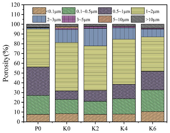 The physical properties of materials are closely related to their microscopic properties, and testing the pore structure is an essential means of testing the apparent microscopic properties. Generally speaking, the theoretical water requirement of CaSO4-0.5H2O is only 18.6% of its weight. Still, in the production process of gypsum self-leveling, the actual amount of water added is much more considerable than its theoretical water requirement, which makes the excess water retained inside the gypsum slurry and precipitated as water vapor with the hydration process of gypsum, which leads to the emergence of many pores inside the gypsum [29]. Generally, pores with pore sizes >200 nm significantly influence gypsum properties [35]. The pore structure of PGSL is seen in Figure 9. Figure 9 shows that the SG-doped PGSL has significantly fewer detrimental pores than the PR-doped one. With the inclusion of SG during compounding, the detrimental pores and overall porosity inside the PGSL were greatly reduced, presumably because the gypsum hardened more quickly. In the early stages, the entire skeletal structure is produced, and as the gypsum continues to hydrate, it solidifies. The hydration of cement is greatly slowed down by the addition of SG, which has a negative impact on the gypsum’s skeleton structure and increases porosity. In conclusion, adding SG can make PGSL’s pore structure smaller.