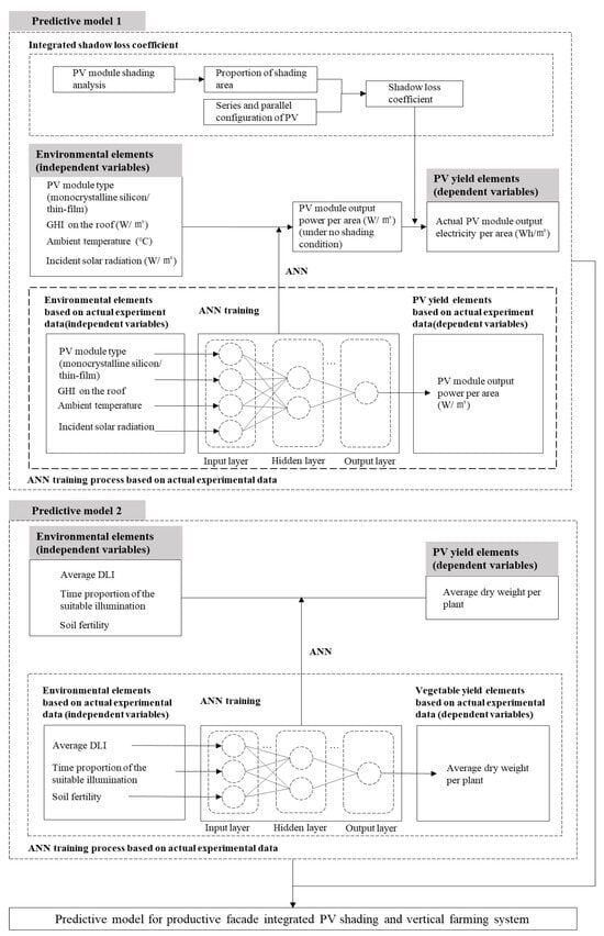 The proposed ANN was trained using experimental data to obtain a predictive model that correlated the environmental and yield elements. Figure 2 depicts two predictive models: Predictive model 1 (environmental and PV shading electricity yield elements) and Predictive model 2 (environmental and vertical farming vegetable yield elements). Through predictive modeling, this paper presents the yield on the southern productive facade of a typical public housing building (point block) in Singapore and analyzes indoor thermal and visual comfort.