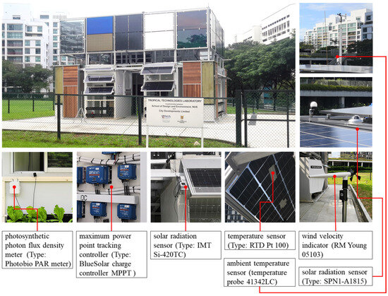 To obtain reliable PV electricity yield and vertical farming vegetable yield data, this study combined an ANN trained and tested by experimental data (given in Appendix A) from the NUS-CDL Tropical Technologies Laboratory (T2 Lab) of the National University of Singapore (NUS) [27,40]. The experimental data included the PV shading electricity yield (monocrystalline silicon, type: assembled by the Solar Energy Research Institute of Singapore/CIGS thin film, type: Solar Frontier SFL85-D) and vertical farming vegetable yield data (lettuce planting). Details of the T2 Lab PV shading system are shown in Table 1 and Figure 1, and the performance indicators of the T2 Lab envelope are shown in Table 2.