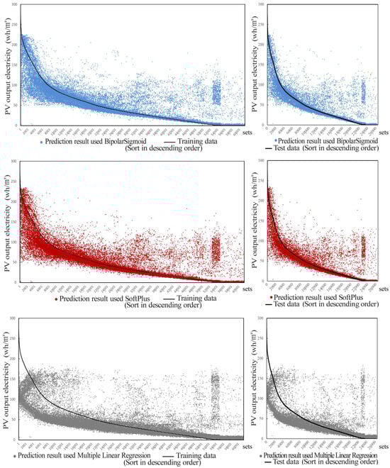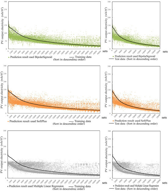 Similar to the evaluation of the monocrystalline silicon PV module, Figure 7 and Table 6 show that the training and test errors of the three models (two ANNs and one multiple linear regression model) were relatively suitable for the thin-film PV module. There was also no overfitting or underfitting of the model. Further analysis showed that the ANN had smaller errors and clear advantages over multiple linear regression. In addition, the MAE and RMSE values of the ANN using the Bipolar Sigmoid activation function were smaller than those for the SoftPlus activation function. Moreover, Figure 8 shows that the ANN prediction results with the Bipolar Sigmoid activation function fit the experimental data better than the other two (R2 = 0.88 for Bipolar Sigmoid; R2 = 0.78 for SoftPlus; and R2 = 0.52 for multiple linear regression) [46]. Therefore, the ANN with the Bipolar Sigmoid activation function was selected as the ANN for the thin-film PV modules.