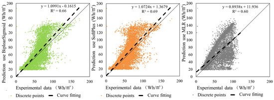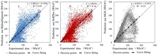 Figure 6 shows the comparison between the predicted and experimental results for evaluation. Considering fitting, the fit for the ANN model using the SoftPlus activation function was highest (R2 = 0.66 for Bipolar Sigmoid; R2 = 0.69 for SoftPlus; and R2 = 0.60 for multiple linear regression) [46]. Finally, the ANN with the SoftPlus function was selected as the ANN module for the monocrystalline silicon PV.