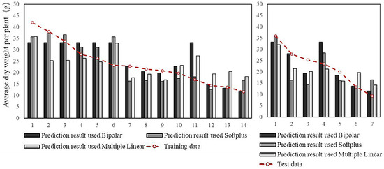 The predictive model aimed to connect the environmental elements (independent variables) with the yield elements (dependent variables). This type of problem is mainly addressed in machine learning through supervised learning in training methods, specifically through an ANN in regression tasks. In this study, the back-propagation algorithm was used to train an ANN with an MLP structure [30]. Two commonly used activation functions (the Bipolar Sigmoid and SoftPlus functions) in the back-propagation algorithm were compared to select the optimal function, and the multiple linear regression model of machine learning was chosen as a reference. In addition, ANN evaluations usually include training and testing errors. Training error expresses an ANNs quality of fit to the training data. If the training error is too large, the ANN has insufficient knowledge of the training data characteristics. Otherwise, the ANN has overlearned the characteristics of the training data if the training error is too small. Therefore, maintaining appropriate training errors is crucial for evaluating the quality of an ANN. In contrast to the training error, the test error characterizes the generalization ability of an ANN. In practical applications, the test error must be as small as possible.