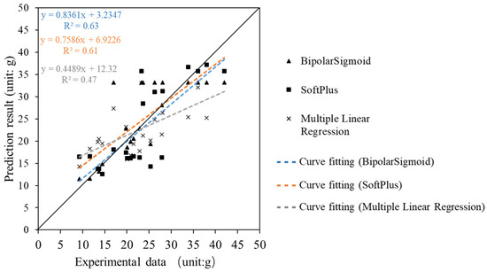 Figure 9 and Table 10 show that the training and test errors of the three models were relatively suitable. The model training results were similar to those of the PV section. Further analysis showed that the overall prediction quality of the ANN was better than that of the multiple linear regression. Specifically, considering the MAE, the training error of the Bipolar Sigmoid activation function was 2.6% higher than that of SoftPlus, but the test error was 44.8% lower. For the RMSE, the training error of the Bipolar Sigmoid was 19% higher than that of SoftPlus, but the test error was 55.1% lower. To further evaluate the quality of the prediction models, the prediction results were compared to the experimental results (Figure 10), and it can be seen from the figure that the ANN prediction results using the Bipolar Sigmoid activation function fit the experimental data better than the other two (R2 = 0.63 for Bipolar Sigmoid; R2 = 0.61 for SoftPlus; and R2 = 0.47 for multiple linear regression [46] (The larger the R2-value is, the closer the curve fits to the diagonal, the better the model’s prediction results).