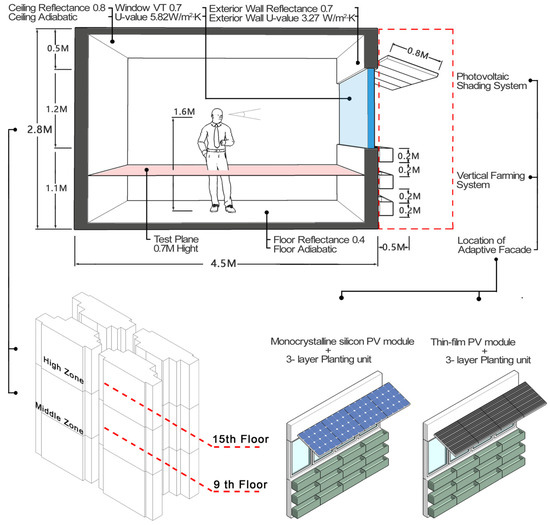 More than half of the world’s population is concentrated in cities that occupy 2% of the Earth’s surface [1]. Buildings in cities represent 36% of the global final energy consumption [2]. This energy demand is always increasing, and the lack of clean energy resources to cover it is a major challenge in reducing the urban carbon footprint. Moreover, the energy consumption of the residential sector is more than three times that of the non-residential sector [3]. As people’s demand for environmental comfort grows, the proportion of “air-conditioned” buildings continues to rise [4]. Reducing the energy consumption of residential buildings and improving the comfort of the indoor environment are important parts of solving the urban energy crisis and improving the quality of the human settlement environment. In addition, the urban-rural gap and globalization have significantly increased food mileage [5]; however, it is still hugely challenging to fully obtain healthy and affordable food in many cities and regions [6]. At present, vertical farming has been adopted to address the limitations of traditional agriculture, the shrinking area of arable land, and increasing food demand [7,8]. However, there is still a lack of research on the potential crop yields of building facades [9,10].