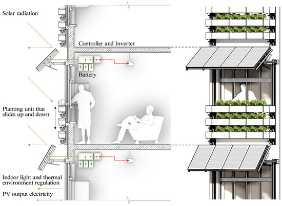 To address environmental and energy problems, a variety of facade design methods and concepts have been proposed in the field of architecture aimed at improving indoor environmental quality [11], significantly reducing building energy consumption [12], and generating a positive impact on local renewable resources, buildings, and human resource consumption [13]. In recent years, the concept of productive facade systems has been introduced by Tablada et al. (2018), in which PV shading devices and vertical farming systems are integrated into building facades. Taking into account the balance between BIPV and BIA, PV shading is usually located in the upper part of the window, while vertical farming is located in the lower part, in order to adapt to the respective system requirements and ensure the accessibility of the indoor view [14]. In addition, the integrated PV module design and modular planting slots are used to ensure the aesthetic effect of the building façade [15].