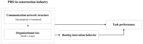 As an organization that aims to innovate products or services, an effective organizational structure can reduce management complexity by facilitating communication and innovation [69]. PBOs in the construction industry are usually operated within an established network structure and communication channels and facilitate the innovation process through knowledge sharing. On the one hand, organization innovation will improve task performance as well as project success [70]; on the other hand, the innovation process will take time, which is in contradiction with the time limitations for task completion of a construction project [71]. Could bootleg innovation be a strategy to resolve this paradox? Based on our literature review, research on bootleg innovation in PBOs still requires further exploration. Furthermore, as the structure of the communication network and organizational size are key parameters reflecting organizational characteristics, they will also influence the collective inclination towards innovation [72]. Therefore, examining PBOs that adopt various communication network structures and identifying at which organizational sizes they are most likely to initiate bootleg innovation, and subsequently assisting organizations to break through challenges in enhancing project performance, is of paramount significance. These arguments lead us to expect that