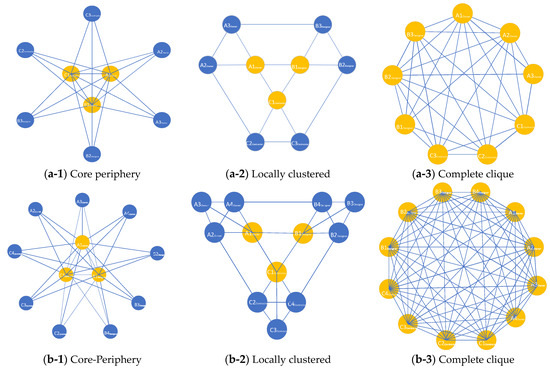 Network visualizations. (a-1–a-3) Network within smaller organizational size (9 points); (b-1–b-3) Network within larger organizational size (12 points).