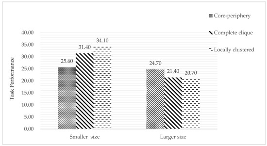 First, a two-way ANOVA was carried out using the communication network structure and organizational size, taking task performance as predictors. The results indicated a significant interaction between the communication network and organizational size (F (1.54) = 25.498, p = 0.000, η2p = 0.486). Following this, a one-way ANOVA was used for simple effect analysis. As shown in Figure 5, when the organization size was smaller, the task performance of the locally clustered structure (M = 34.10, SD = 2.644) was significantly higher than the core periphery structure (M = 25.60, SD = 2.633; F (1.18) = 20.909, p = 0.000, η2p = 0.742). Additionally, the task performance of the complete clique structure (M = 31.40, SD = 3.026) was significantly higher than the core periphery structure (M = 25.60, SD = 2.633; F (1.18) =20.909, p = 0.000, η2p = 0.573). Thus, H1a was supported. On the other hand, when the organization size was larger, the task performance of the core periphery structure (M = 24.70, SD = 3.889) was significantly higher than the locally clustered structure (M = 20.70, SD = 1.947; F (1.18) = 8.461, p = 0.000, η2p = 0.320) and the complete clique structure (M = 21.40, SD = 2.675; F (1.18) = 4.888, p = 0.004, η2p = 0.214). Thus, H1b was supported. Therefore, H1 was validated.