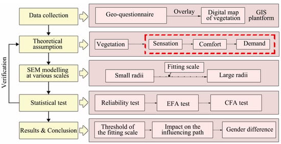 Accordingly, the flowchart of this study is presented in Figure 1. (1) Subjective thermal data in conjunction with location and digital vegetation information are gathered through a geo-spatial positioning survey and subsequent GIS analysis. (2) A theoretical hypothesis is proposed to delineate the complex interplay between the questionnaire and the spatial vegetation data set. (3) The intricate interconnections among variables are encapsulated within a structural equation modeling (SEM) framework, and the model fit of SEM across multiple spatial scales is compared to ascertain the fitting scale. (4) The model is tested to validate the theoretical hypothesis through reliability and validation testing. (5) The findings are interpreted in terms of the scale effect, pathways of influence and gender disparities.