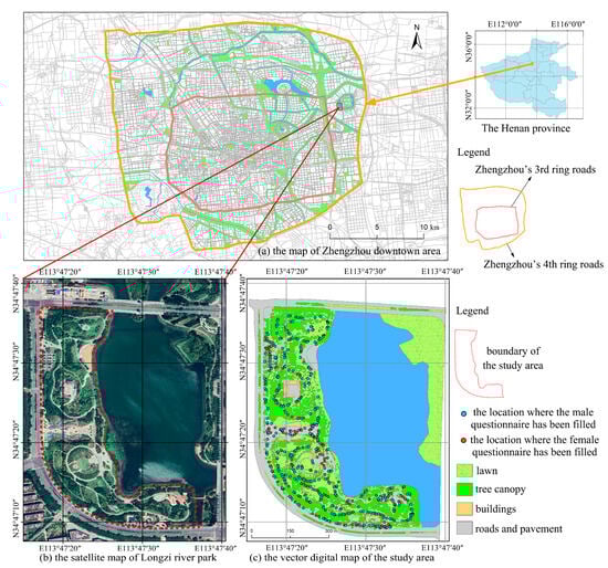 This park is positioned between the third and fourth ring roads of Zhengzhou city (Figure 2a). It is proximate to a metro station and surrounded by numerous universities, residential areas, and commercial centers, resulting in a dense population concentration. The park is designed to blend ecological conservation with recreational, fitness, and entertainment amenities, providing a serene sanctuary for local residents seeking respite from the scorching summer heat.