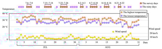 A geo-spatial questionnaire survey was conducted from July to August 2023, the specific days are labeled in Figure 3 with the dynamics of outdoor thermal environment for each research day. From Figure 3, the parameters of the outdoor thermal environment remained relatively constant during the survey days. Clear evening hours (17:00–19:00) were chosen for distributing questionnaires, during which period the park experiences peak visitor numbers. Consequently, research conducted during this period can benefit a larger number of individuals, thereby enhancing the practical implications of this study.