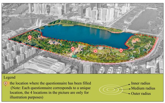 Moreover, a foundational research premise was postulated that the real-time thermal comfort of visitors varies with their location and is influenced by multi-scaled vegetation environments. At each of the 525 geo-questionnaire points, statistical buffer zones of varying radii are established (Figure 4). The areas of lawn and tree canopy within each radius are calculated and attributed to the central points where the geo-questionnaires are completed, thereby correlating vegetation density with thermal comfort across different radius ranges.