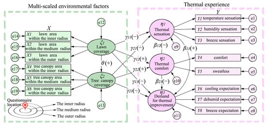 In the equation, ΛX constitutes the factor loading matrix concerning the latent variable ξ, and ΛY represents the factor loading matrix related to the latent variable η. B represents the effect coefficient matrix among different η; Γ denotes the effect coefficient matrix of multi-scale vegetation on thermal experience; ε constitutes the residual of the structural model.