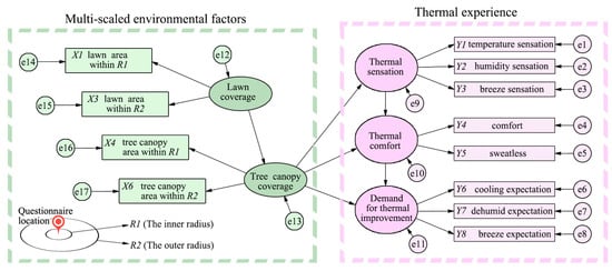 Structural equation modeling (SEM) represents a method that integrates a structural model and measurement model for the purpose of measuring the intricate relationships and effects among multiple independent variables and multiple dependent variables []. In this research, the multi-scaled vegetation areas are regarded as independent variables and the subjective thermal experience is regarded as dependent variables.