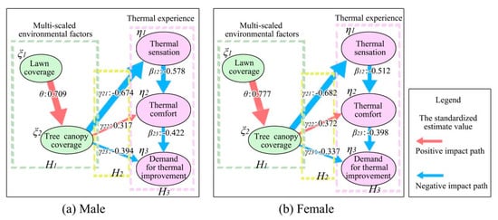 The influence of the vegetation environment on thermal experience varies between male and female subjects. Regarding the indirect effects of γ11 and γ12, as well as the direct effects of γ21 and γ22, the absolute values of these effects are greater in the female subjects than in the male subjects (Table 4), indicating a stronger influence of vegetation on females’ thermal sensation and thermal comfort. Concerning the indirect effect of γ13 and the direct effect of γ23, the absolute values of these effects are greater in the male compared to that of the female, suggesting a more significant influence of vegetation on males’ thermal demand.