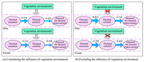 There exist disparities between men and women regarding the thermal experiencing process under the influence of vegetation environments. Whether it is the direct effect of β12 and β23, or the indirect effect of β13, the absolute values of these path coefficients exhibit higher values in men than in women, indicating a stronger sequence of “sensation → comfort → demand” in males compared with females. Consequently, if given the identical vegetation environment and the same level of thermal sensation, men subjects exhibit lower thermal comfort and higher thermal requirements.