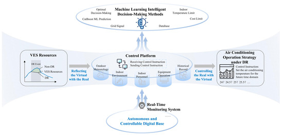 When the grid requires buildings to adjust their load, buildings can achieve load reductions or shifts through temperature regulation, by shutting down non-essential equipment, by using energy storage systems, and by implementing building energy management system (BEMS). Among these methods, energy storage devices, particularly electrochemical storage, are the most direct measures. They not only compensate for the volatility of the power system but also enhance the safety of building electricity use [7,8,9]. However, due to issues such as initial investment costs, maintenance, and lifecycle concerns, this approach is challenging to implement on a large scale. In recent years, virtual energy storage (VES) in buildings has gained considerable attention. A VES avoids the aforementioned initial investment costs and space limitations, making it a viable alternative to battery storage [10], and is considered one of the most valuable DR resources [3,11]. Building a VES originates from the thermal buffering capacity of building envelopes and indoor environments. When heating, ventilation, and air conditioning (HVAC) systems cool or heat indoor spaces, the stored cold or heat is retained within the building envelope, indoor equipment, and air. Thus, reducing the cooling or heating power of an HVAC system decreases the electricity load without immediately changing the indoor temperature, but rather by releasing the stored cold or heat, resulting in a gradual temperature increase or decrease. This process is analogous to charging and discharging energy storage devices [12,13,14].