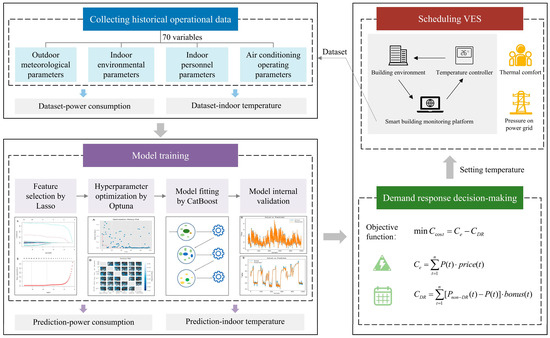 Boosting is an ML technique used to reduce bias in supervised learning and is known for its outstanding performance [3]. The Boosting family includes algorithms such as CatBoost, XGBoost, and AdaBoost. Bian et al. [46] utilized the CatBoost and AdaBoost algorithms to predict an HVAC system’s power consumption, demonstrating their excellent predictive performance. Kaligambe et al. [47] designed and trained several XGBoost models to estimate the indoor temperature, relative humidity, and carbon dioxide concentration, confirming the accuracy of these models and their suitability for optimal HVAC system control in smart buildings. Wang et al. [3] introduced an HVAC system predictive control strategy based on the XGBoost algorithm to enhance daytime DR. CatBoost is one of the principal algorithms in the Boosting family, proficient in handling both numerical and categorical data. It is noted for its robustness, versatility, platform applicability, and prediction speed [48]. In this study, we leveraged the CatBoost algorithm for model development and training, followed by a demand response decision analysis based on the prediction results. The basic process involved first developing and training a machine learning-based model for predicting the AC load and indoor temperature. Feature selection was conducted using a LASSO regression model, and HPO was performed following the Optuna framework to optimize computational efficiency and model performance, further enhancing the model’s performance and generalization capabilities. Subsequently, simulations were conducted based on real-time measurements from building equipment and environmental data. Using the prediction results, decisions were made to set the temperature for cost optimization within a comfortable indoor temperature range. Finally, temperature setting commands were issued to the AC’s temperature controllers via the building equipment management system, adjusting the building environment to schedule building a VES and to achieve user-side DR control. The principle behind this process is illustrated in Figure 2.