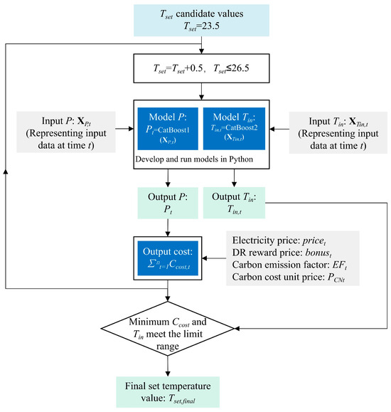 Building VES resources allows for the adjustment of or shift in the required loads by modifying the AC set temperature without violating the constraints of comfortable indoor temperatures. In this study, we follow the same principle for load adjustment decisions. Additionally, under the DR requirements of the grid, cost-oriented load adjustment has significant potential for widespread adoption. Therefore, the primary decision objective for setting the temperature in this study is to minimize AC operating costs while maintaining the constraints of comfortable indoor temperatures. The specific process for deciding on the set temperature is illustrated in Figure 3. First, the method involves manually dividing the AC set temperature range and then defining the adjustment range from 23.5 °C to 26.5 °C with a granularity of 0.5 °C, which serves as the candidate set temperatures [3]. Simultaneously, the comfortable indoor temperatures were constrained to between 23 °C and 27 °C. This range was chosen based on historical operating temperatures to ensure that the indoor environment remains within an acceptable range for occupants. Given the constraints of economic costs, the cost formula is as follows: