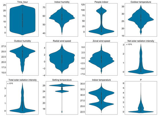 The data used in this study were collected from an office building in Nanjing, China. The building’s equipment management system is illustrated in Figure 4. Approximately 12,500 data entries were collected. After excluding data points related to the non-operational periods of the AC system and removing extreme outliers, the dataset was refined to about 5000 continuous entries. The initial feature set included 12 variable categories (X1–X12), comprising current time (H), indoor humidity (Din), indoor occupancy (Min), outdoor temperature (Tout), outdoor humidity (Dout), radial wind speed (Vradial), zonal wind speed (Vzonal), net solar radiation intensity (Rnet-solar), total solar radiation intensity (Rtotal-solar), set temperature (Tset), AC power consumption (P), and indoor temperature (Tin). Table 1 presents statistical descriptions of these variables. The data were systematically updated every 10 min, resulting in a comprehensive dataset with 70 variables (X1–X12 for the past 10 to 50 min and X1–X10 for the current time). The distributions of the 12 variables are shown in Figure 5.