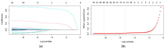 Feature selection via LASSO analysis. (a) Plots for LASSO analysis coefficients; (b) cross validation plot for the penalty term.