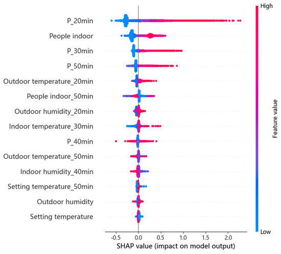 LASSO regression was employed to handle any redundant variables and to enhance the model’s practicality. The variable selection process in LASSO regression is depicted in Figure 6. As the penalty coefficient (Lambda) increased, the coefficients of certain variables approached zero, indicating their limited impact on the model. After applying LASSO regression, 14 variables were retained for the final model (Model 1: AC power consumption prediction model). These variables were Min, Dout, Tset, Tout_20 min, Dout_20 min, P_20 min, P_30 min, Tin_30 min, Din_40 min, P_40 min, Min_50 min, Tout_50 min, Tset_50 min, and P_50 min. To explore the importance of the model input features, Shapley additive explanation (SHAP) values were used to rank the significance of the variables used in the model’s construction (Figure 7). For Model 2 (the indoor temperature prediction model), nine variables were included: H, Min, Din_10 min, P_10 min, Din_20 min, P_20 min, Tin_20 min, Tset_40 min, and Tin_50 min.