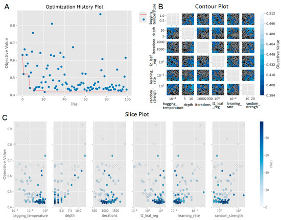 HPO process of Model 1. (A) Optimization history plot: each blue point represents the result of a trial, and the dark orange line represents the best objective function value; (B) Contour plot: the horizontal and vertical axes represent two different hyperparameter values, while the contour lines indicate the objective function value. Different colored regions represent various ranges of the objective function value, with darker colors indicating lower values. (C) Slice plot for hyperparameters: the shade of color represents the influence of every parameter on the model’s performance.