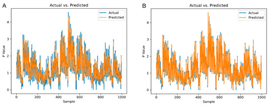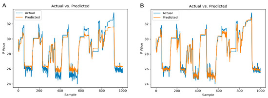 Comparisons of prediction performance for Model 2 before (A) and after (B) hyperparameter optimization. The blue line indicates the actual value; the yellow line indicates the predictive value.