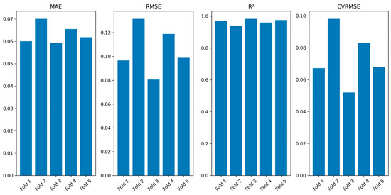 Based on the above methods, the optimal CatBoost models were obtained. The final 20% of the dataset was used to fit the models, designated as the internal validation set. Detailed results of the model validation are presented in Table 3 and Table 4. The results show that Model 1 achieved an MAE of 0.06, an RMSE of 0.08, an R-squared value of 0.98, and a CV-RMSE of 6.4%. Model 2 exhibited an MAE of 0.36, an RMSE of 0.62, an R-squared value of 0.94, and a CV-RMSE of 2.2%. Both models demonstrated low error rates and superior prediction performances. Additionally, K-fold cross-validation was conducted to further assess model robustness and performance, providing additional validation of the models’ effectiveness (Figure 11).
