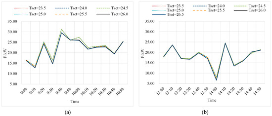 Predicted P under different potential set temperatures during two time intervals: (a) 09:00~10:50; and (b) 13:00~14:50.