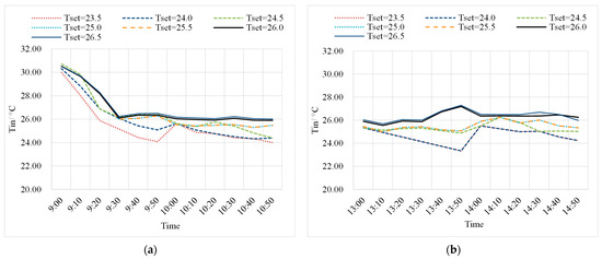 Predicted Tin under different potential set temperatures during two time intervals: (a) 09:00~10:50; and (b) 13:00~14:50.