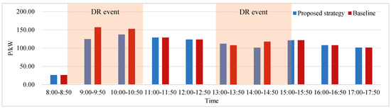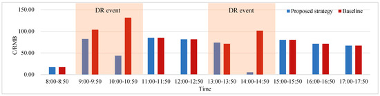 Through a decision-making process constrained by cost minimization, the optimal set temperature combination was determined. In detail, during peak demand periods, set temperatures were adjusted to 25.0 °C at 09:00, 26.5 °C at 10:00, 25.0 °C at 13:00, and 26.0 °C at 14:00. Starting from 08:00, the total electricity consumption and cost for the corresponding day were calculated, as depicted in Figure 14 and Figure 15. In Figure 14, the power consumption during the DR event corresponds to the AC power consumption at the optimal set temperature combinations. Furthermore, in Figure 15, the cost under the DR event represents the comprehensive cost associated with the AC power consumption at these optimal set temperatures, including both electricity costs and any cost returns during the DR period, as calculated according to Equation (1). Compared with the scenario without demand response, the AC power consumption was reduced by 5.25% and the cost savings amounted to 24.94%, effectively shifting peak loads and demonstrating the economic benefits of this strategy. Specifically, the model effectively balanced the flexibility of temperature adjustment with economic efficiency by using finely tuned set temperature candidates (ranging from 23.5 °C to 26.5 °C in 0.5 °C increments) and comprehensive cost calculations (including both electricity costs and DR incentives), ensuring its effectiveness and cost-efficiency in practical applications.