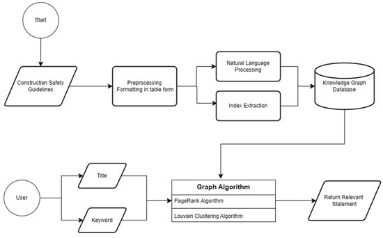 This approach is particularly applicable to construction safety guidelines, where important terms are frequently repeated without significant omissions. By providing specific keywords and guideline titles, users enable the analysis of relevant content, categories, and indexes. The graph projection, obtained from the provided data, is subjected to the PageRank algorithm and the Louvain Clustering algorithm. The Louvain Clustering algorithm effectively groups inter-related graph components, while the PageRank algorithm quantifies the importance of nodes within each cluster. This process facilitates the identification of key content within each cluster. By employing these algorithms, the recommendation and search system effectively identifies and groups related guidelines, enabling access to pertinent content based on their input. This scholarly approach enhances the accessibility and usability of construction safety guidelines, contributing to improved decision making and enhanced safety management in the construction industry.