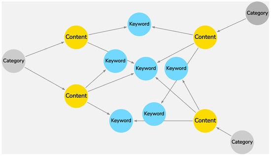 The TF-IDF weight function was then used to extract the index of each token (i.e., keywords) within the sentences based on their TF-IDF scores [,]. The n_gram parameter was configured as 1 to 3 to account for frequently recurring key terms that form a cohesive meaning at the sentence level. For each entry in the content column, the TF-IDF function calculated the weights of individual tokens, with higher-weighted tokens indicating their importance. These tokens were stored as indices in the index column, facilitating the mapping of links between items in the KG.