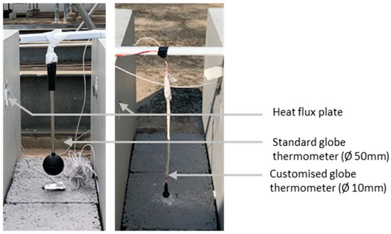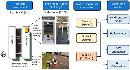 Figure 1) to investigate globe temperature regulation using cool materials in an urban canyon scale model setup. A series of scale model measurements were carried out, and their results were compared against real scale measurements. Specifically, the scale model measurements aimed to evaluate the effect of different globe sizes (10 mm and 50 mm) on GT, which were then compared to those obtained from the standard 150 mm globe used in the real scale setup. The real scale measurements were carried out in an industrial site in Singapore (a region characterized by a tropical climate) which represented a typical street canyon. Singapore (latitude: 1°17′ N, longitude: 103°50′ E) experiences high yearly solar insolation (1680 kWh/m