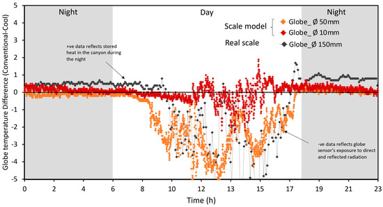 In comparing the temporal differences between the GT measurements observed for the 10 mm and the 50 mm globe thermometers, there is a negligible difference (close to zero) during the night in case of the 50mm globe. However, this difference was over 0.6–0.8 °C in the case of the 10 mm globe and up to 1 in case of the 150 mm globe used in the real scale experiment when compared with the results for the standard 50 mm globe. It is, however, important to note that the results for the 10 mm globe are more comparable with the difference in GT observed in the real scale (1:1) experiment. This was due to the obvious difference in the surface area of the globes. It is apparent that although the view factors/angle factors of the temperature sensor within the globe are same, the surface area of the 50 mm globe exposed to surrounding canyon surfaces is increased by five times in comparison with that of the 10 mm globe, which leads to higher GT values during the daytime and quicker heat dissipation (loss) during the nighttime. In addition to the dominant effect of direct solar radiation causing larger difference during the daytime, higher convective heat transfer in the case of the 50 mm globe seems to decrease the difference in GT during the nighttime. Thus, when studying the temperature of the canyon (enclosure) in scale models, the scaling of the globe is a concern.
